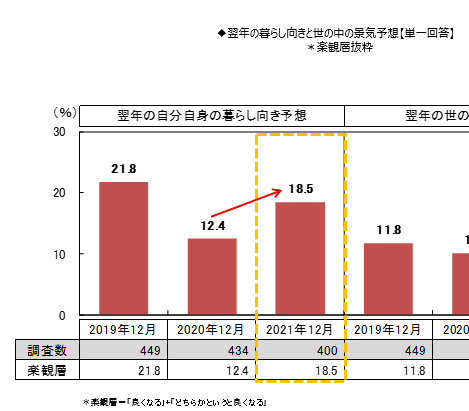 とくに『世の中の景気』については、コロナ禍前の2019年調査時よりも楽観層の割合が高い。