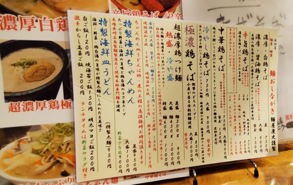 メニューは鶏そばに中華そば、旨辛そば、つけ麺、ちゃんぽん、皿うどんなどと豊富。