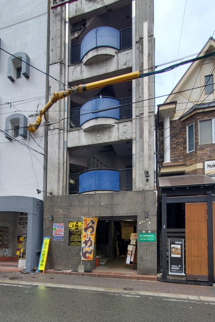 ビル1階の奥まったところに「海猫屋」ののれんや看板が見えます。