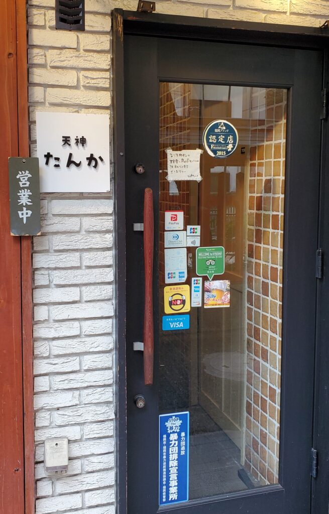 「天神たんか」は、アクロス福岡向かいの側水鏡天満宮横丁の真ん中ほどにあります。