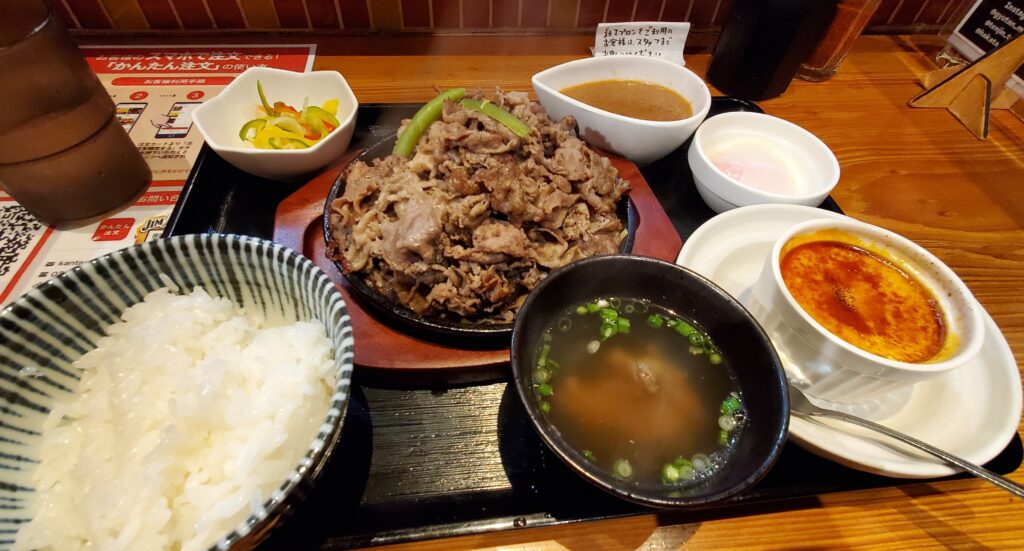 バタービーフにはお肉増量かつ温玉・スープ・デザートが付いてくる夢のフルセット税込み1089円があるので、こちらにしました。