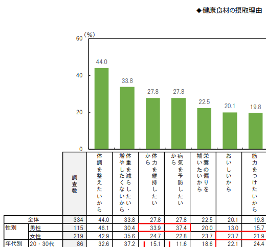 〇男性や高齢層は「体力維持」や「病気予防」といった、健康面での現状維持が目的となっているのに対し、女性や若年層は「おいしい」「筋力をつけたい」「美容のため」といった割合が2割を超え、健康とは異なる面の理由も目立つ。