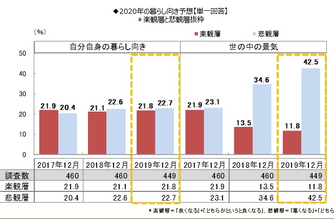 世の中の景気は、「楽観層」11.8%、「悲観層」42.5%。